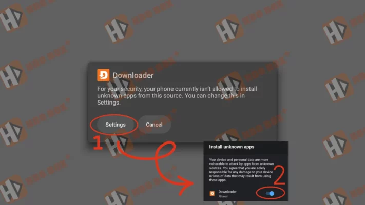 Note: If the “Install unknown apps” warning appears, select “Settings” and swipe right to grant “Allow” permission to the “Downloader” app.